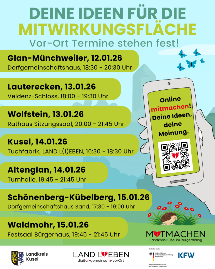 in sieben Gemeinden im Landkreis Kusel (Altenglan, Kusel, Lauterecken, Schönenberg-Kübelberg, Waldmohr, Wolfstein und Glan-Münchweiler) entstehen derzeit sogenannte Mitwirkungsflächen – offene Treffpunkte, die künftig Raum für Begegnung, Freizeit, Naturerlebnis und Umweltbildung bieten sollen. Welche Angebote dort entstehen, wird gemeinsam mit den Bürgerinnen und Bürgern entwickelt.